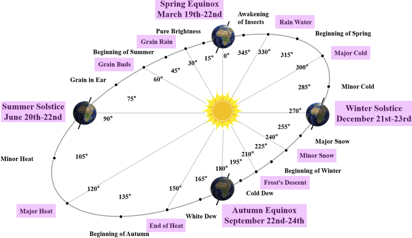 However, according to Kepler's laws, the Earth does not travel around the sun at an even speed. This can be easily proven by the fact that there are about 88 days between the winter solstice and the spring equinox, but about 93 days between the spring equinox and the summer solstice. Therefore, with the help of western missionaries, 定气法 (the steady term method) came into play in 1645 AD, dividing the solar terms strictly based on the ecliptic longitude, i.e. 0° = 春分 (spring equinox), 15° = 清明 (clear and bright) etc.